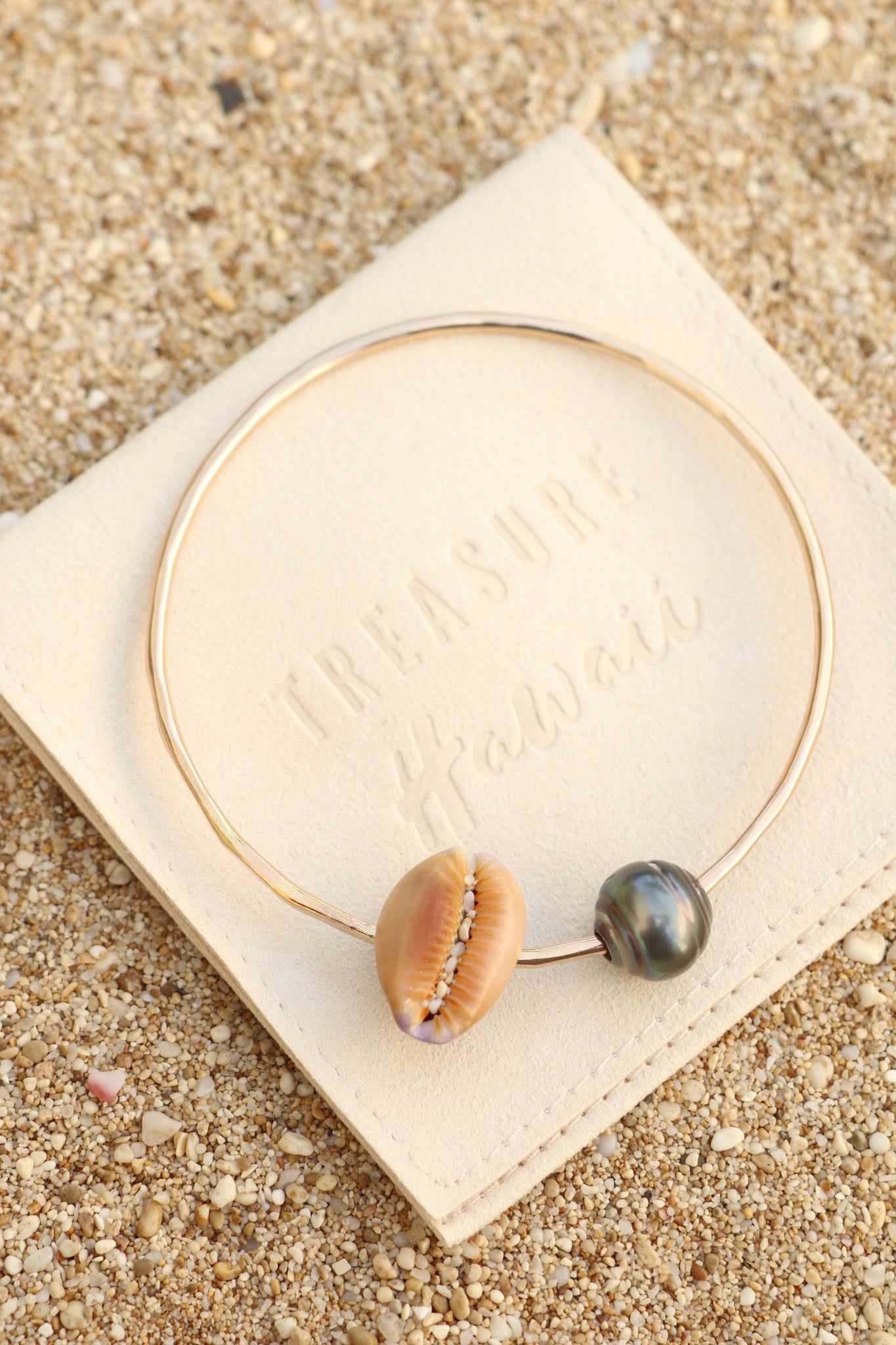 Each bangle is handcrafted from 12-gauge wire, shaped, hammered, and polished by hand for a smooth, durable finish. Every piece features a unique ocean-found shell collected on Oʻahu, with details and textures that vary from bangle to bangle.