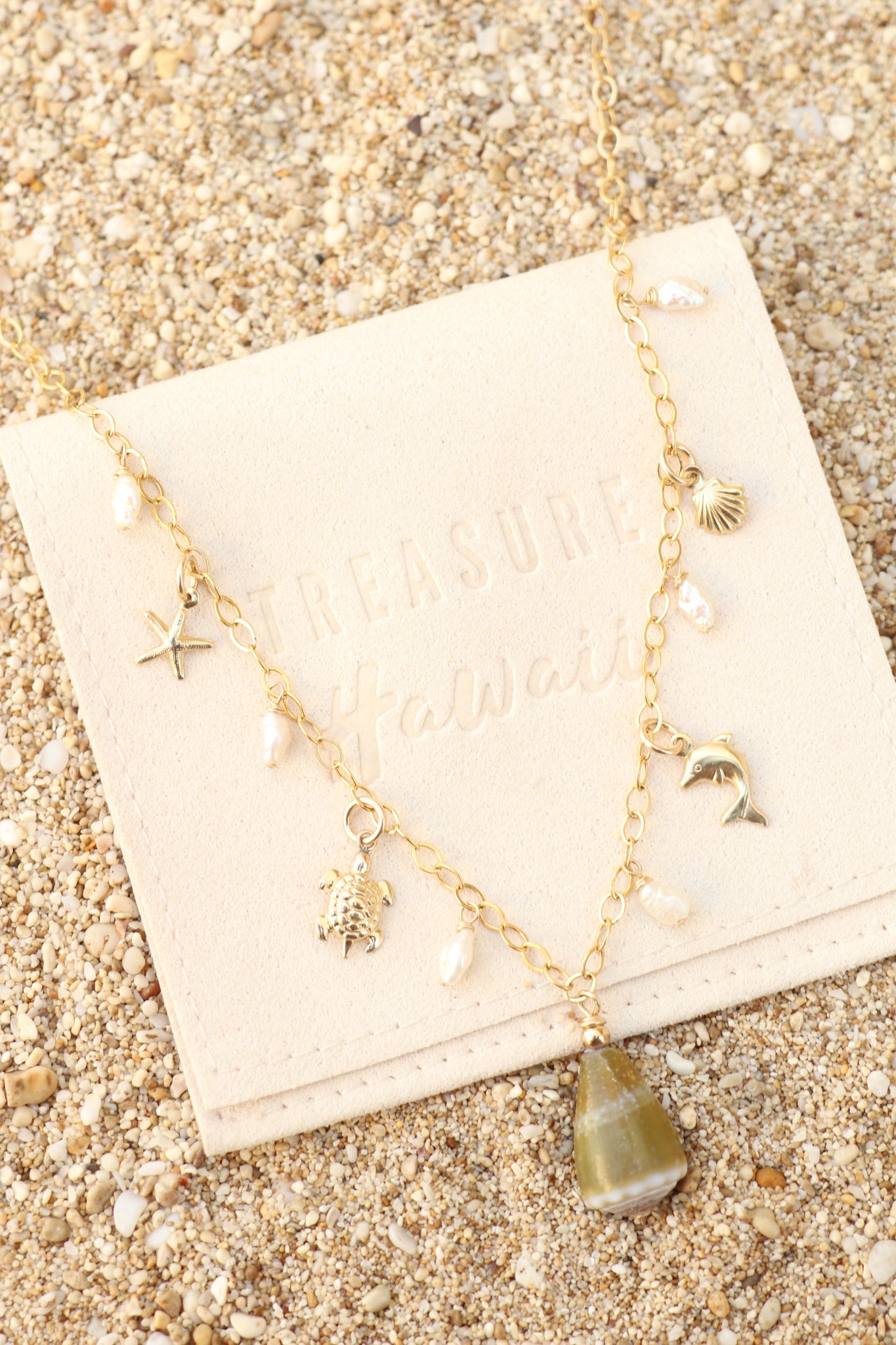 A timeless piece featuring 14k gold-filled ocean charms, freshwater pearls, and a premium shell found by Treasure Hawaii while free diving in Oahu.