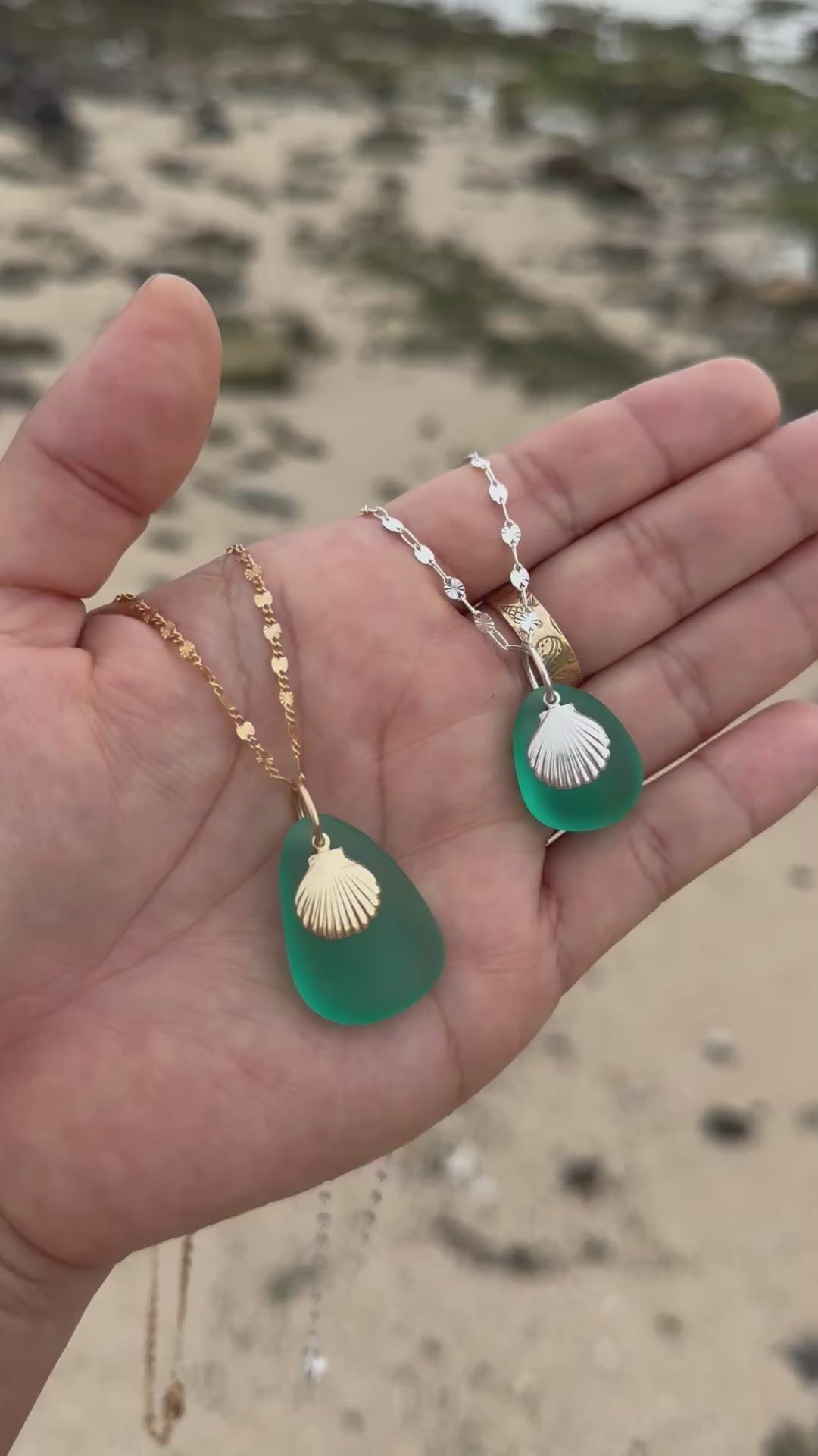 The turquoise seaglass used in these pieces has been collected over a decade of beachcombing and diving around Oʻahu, making this release especially meaningful. Each necklace follows the same design, but every piece of seaglass is naturally shaped by the ocean, so the exact shape and size will vary slightly.